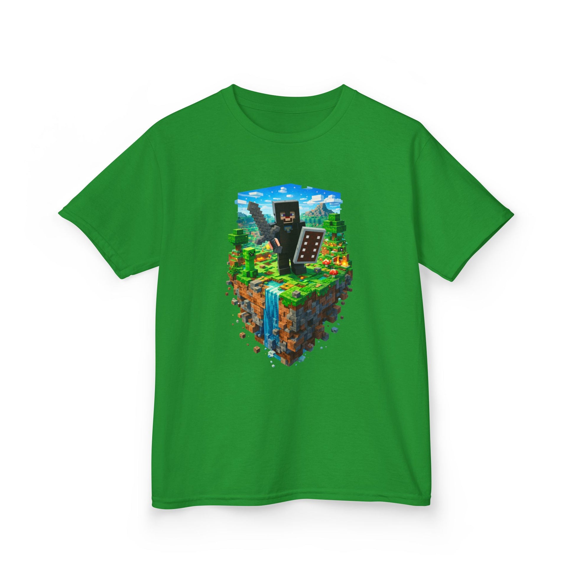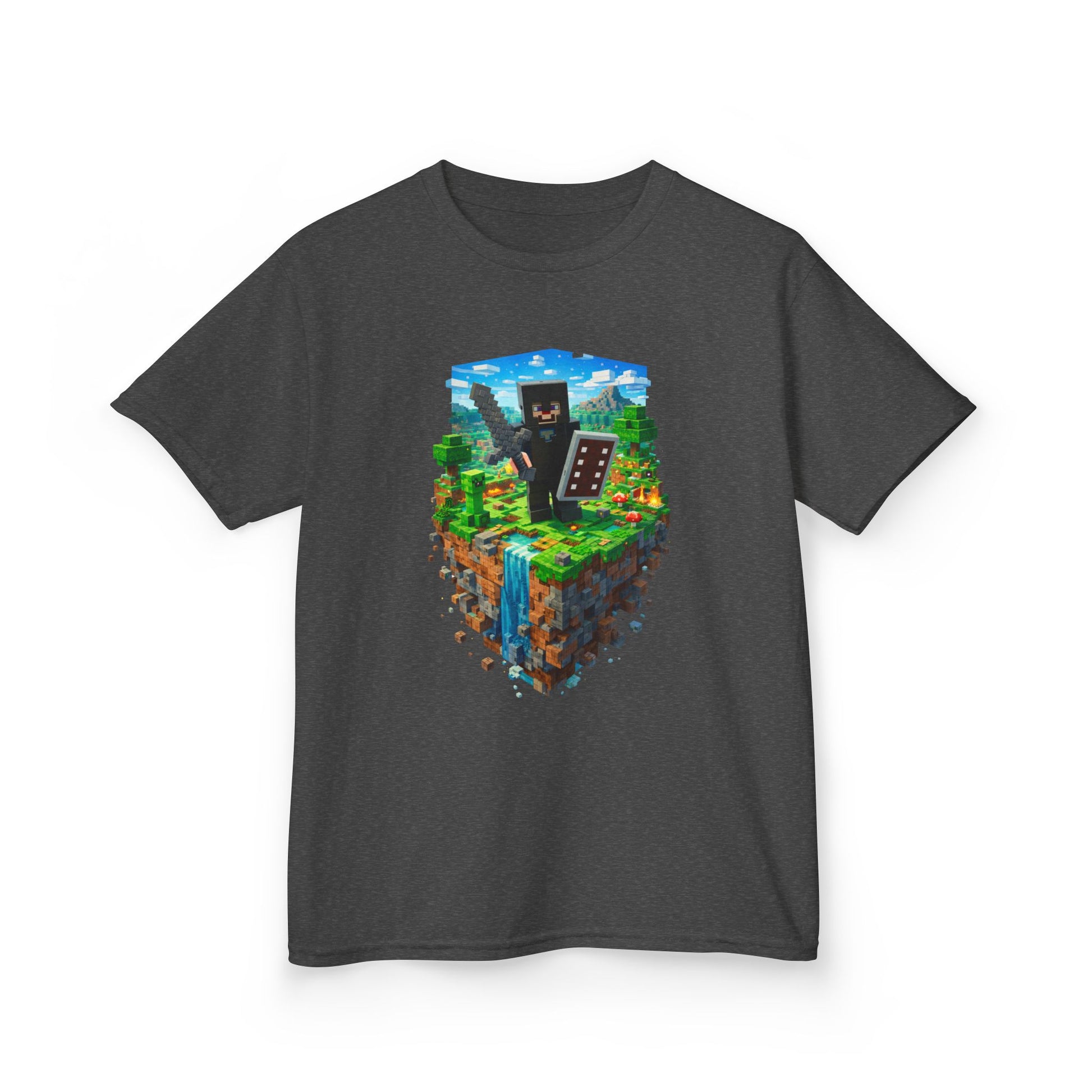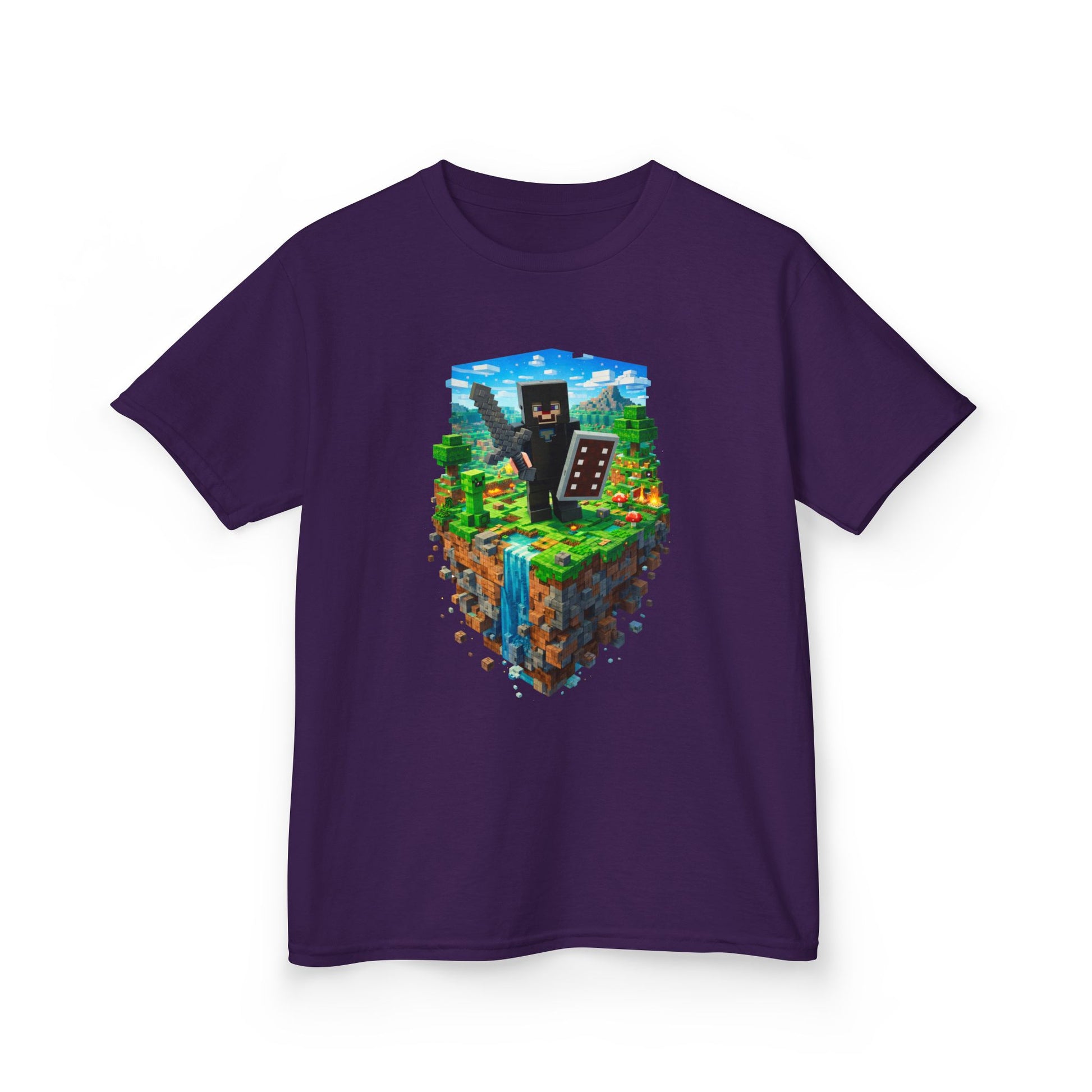This vibrant kids tee brings a slice of blocky, pixel-adventure to everyday play. A floating island scene—lush grass, a tumbling waterfall, and a cheerful block character holding a pickaxe and shield—sits bright and bold on a midweight, soft cotton shirt. The classic crew neck and timeless fit let kids move freely from backyard builds to screen-time quests while the tear-away label keeps them comfortable. Ethically sourced US cotton and durable construction mean the colors and print stay lively through washes and rough-and-tumble fun.