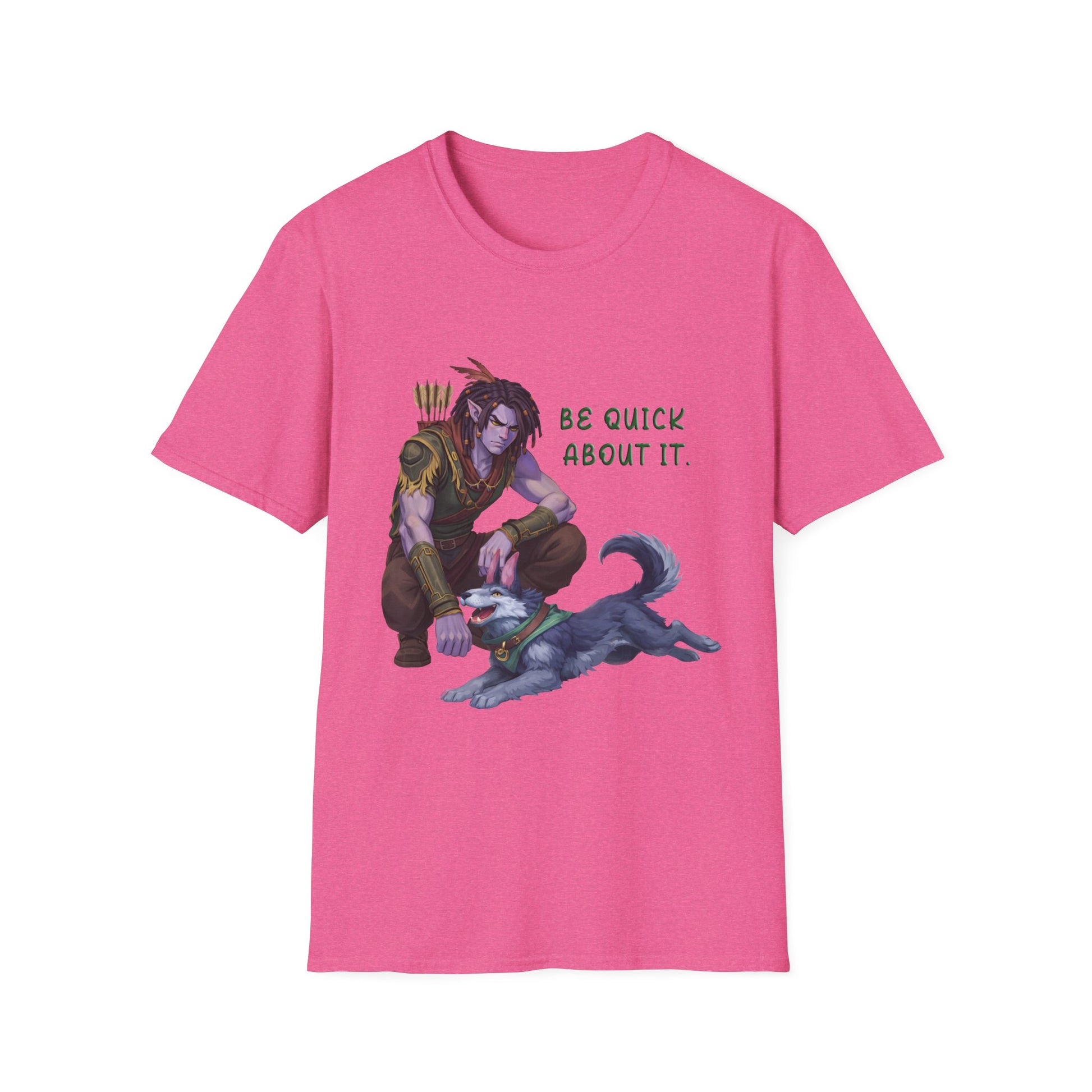 Soft, breathable tee with a playful fantasy illustration: a relaxed Hassian crouches beside a content, playful Tau while the phrase "Be quick about it." adds dry humor. Lightweight ring-spun cotton drapes easily for everyday wear and keeps the printed colors crisp thanks to quality DTG/DTF printing. The neutral natural tone with subtle flecks brings a lived-in, earthy look that complements layered outfits for adventures, game nights, or casual city strolls. Wear it when you want to show a quiet, wry confidence — and a fondness for loyal companions and storytelling worlds.